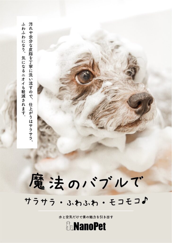 当サロンは、魔法のバブル【ナノペット2】の導入店です。 全コースにかけ流しで標準サービスになります。 ナノペットとは? ナノペットは、 ペット専用のナノバブル発生装置です。 使っているのは水と空気だけ。微細なバブルで汚れを丁寧に除去すること で、 ペット本来の毛並みや、健やかな皮膚環境を保ち、素の魅力を引き出しま す。 特徴① 施術の負担軽減 ナノバブルのシャワーは、水道水よりも水切れが良いのが特徴。 ドライ時間が最大35%短縮され、 結果的にトリミング時間も短縮されることで、ペットにかかる負担も軽減。 特徴② 肌の弱いペットにも ナノペットで使うのは水と空気だけなので、 皮膚がデリケートなペットや、体力の少ない赤ちゃんや高齢期のペット、 アレルギーや皮膚病を持っているペットなど、広くお使いいただけます。 特徴③ きれいなお水で ナノペットは「かけ流し式」を採用。 家のシャワーのように、常に新しいお水を使って洗浄するので衛生的です。 水流はやわらかく、機械音も小さいため、シャワーが苦手なペットにもおす すめです。 特徴④ 驚きの仕上がりに 汚れや余分な皮脂を丁寧に洗い流すので、毛穴やキューティクルはもちろ ん、 爪垢や耳のベタつきもすっきり。仕上がりはサラサラ、ふわふわになり、 気になるニオイも軽減されます